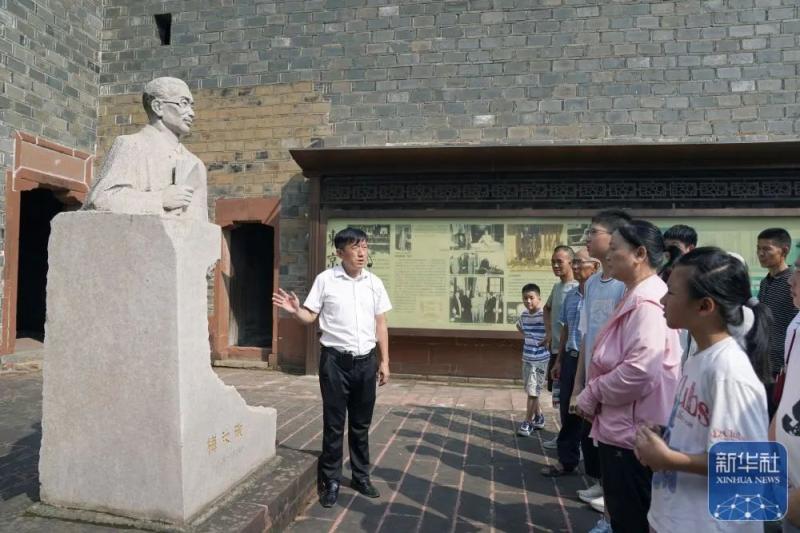 2025年8月1日,梅汝璈故居讲解员梅庭军(左一)向游客介绍梅汝璈。