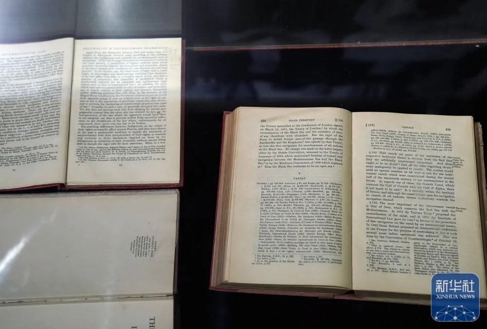 2025年8月1日在梅汝璈故居拍摄的梅汝璈在东京审判中用过的国际法专业工具书。