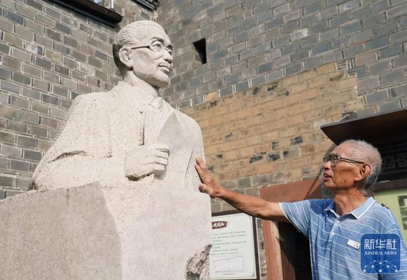 2025年8月1日,78岁的梅氏家族长辈梅华林在梅汝璈故居院中瞻仰梅汝璈雕像。